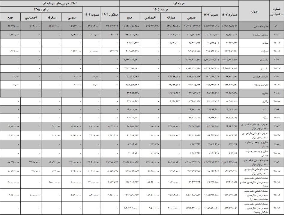 در این میان بررسی ﺟﺪﻭﻝ ﺷﻤﺎره 6 بودجه که نشان دهنده «ﺑﺮﺁﻭﺭﺩ ﺍﻋﺘﺒﺎﺭﺍﺕ ﻫﺰﻳﻨﻪﺍی و تملک داراییهای ﺳﺮﻣﺎﻳﻪﺍی ﺑﺮ اساس امور، فصل» است و امسال در شکلی متفاوت از سالهای قبل منتشر شده نشان میدهد در مجموع بیش از یک هزار و ۱۷۹ همت به فصل حمایت اجتماعی اختصاص یافته است. از این رقم، سهم اعتبارات هزینهای بیش از یک هزار و ۱۷۴ همت و سهم اعتبارات تملک داراییهای سرمایهای بیش از پنج همت در نظر گرفته شده که به ترتیب نسبت به رقم مصوب سال 1404 معادل 26.9 درصد و 55.9 درصد افزایش داشته است.
