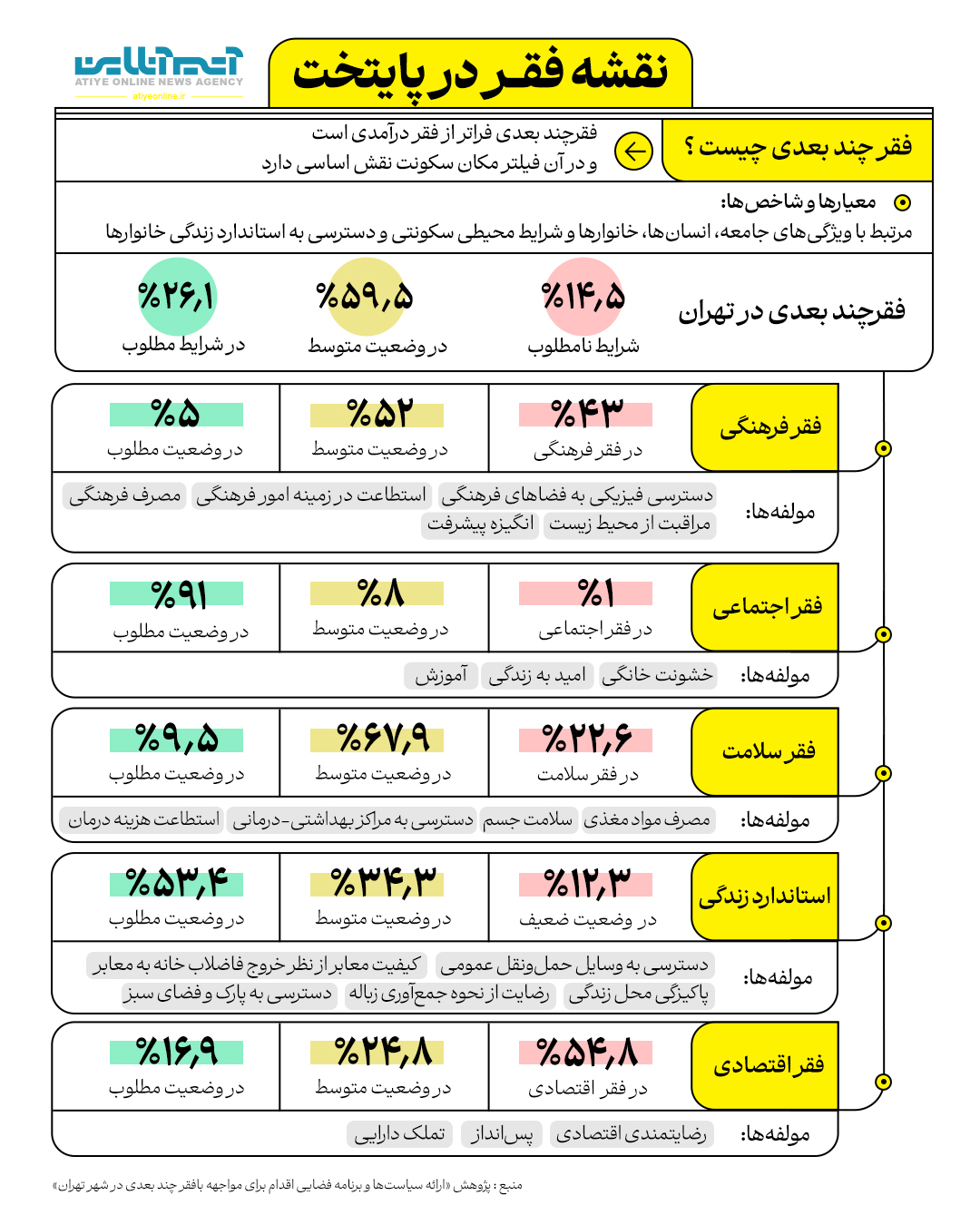 فقر چندبعدی فراتر از فقر درآمدی است و در آن مکان سکونت نقش اساسی دارد. در این تصویر وضعیت شهروندان تهرانی را از نظر مولفههای چندبعدی میبینید.