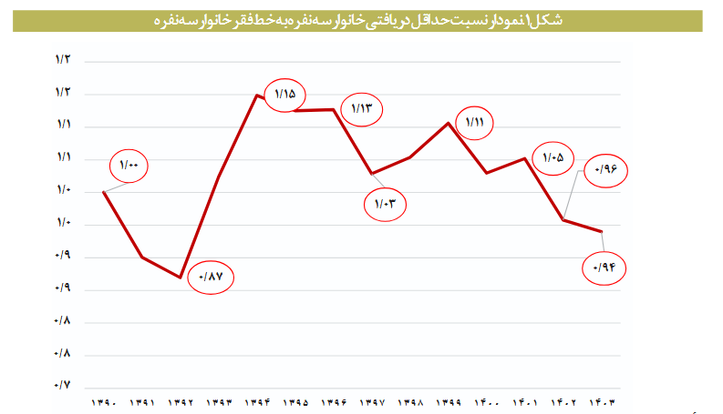 نسبت حداقل دریافتی به خط فقر برای خانوار سه نفره از سالهای ۱۳۹۹ به بعد روند نزولی داشته و بعد از سال ۱۴۰۱ به زیر عدد یک رسیده است (عدد یک به معنی تطبیق حداقل دریافتی با خط فقر است و در صورت تحقق به این معنا است که تمامی کارگران حداقل بگیر (خانواده سه نفره) روی خط فقر قرار میگیرند). دلیل اصلی روند کاهشی این نسبت جاماندن نرخ رشد حداقل دستمزد در مقایسه با نرخ تورم است که باعث شده سبد فقر محاسباتی با آهنگ تندتری نسبت به حداقل دستمزد رشد کند و نتیجه آن نزولی شدن نمودار در سالهای جهش فقر در اواخر دهه ۹۰ است. بر اساس برآوردهای مطالعه نسبت حداقل دریافتی خانوار سه نفره به خط فقر در سال گذشته حدود ۹۴ درصد بوده که همچنان کمی بیشتر از کمینه این عدد در دهه ۹۰ یعنی سال ۱۳۹۲ است.