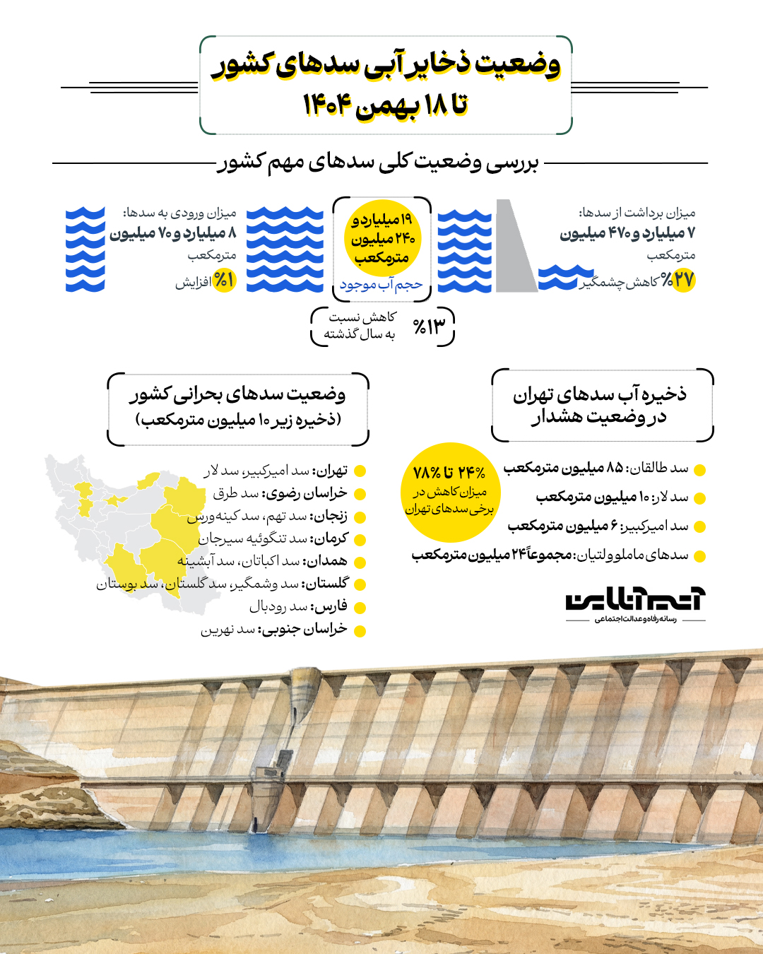 وضعیت سدهای آب کشور همچنان نگرانکننده است. آخرین آمارها تا تاریخ ۱۸ بهمن نشان میدهند حجم آب موجود در سدهای بزرگ کشور ۱۳ درصد کمتر از سال گذشته است. در این تصویر وضعیت سدهای کشور را ببینید.