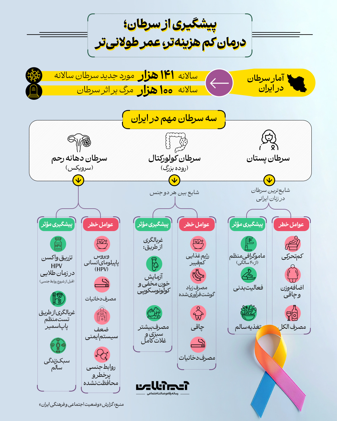 سالی ۱۴۱ هزار مورد جدید سرطان در کشور شناسایی میشود. بسیاری از سرطانها را میتوان با غربالگری به موقع شناسایی و درمان کرد. در این تصویر عوامل خطر و پیشگیری موثر از سه سرطان شایع را در ایران ببینید.